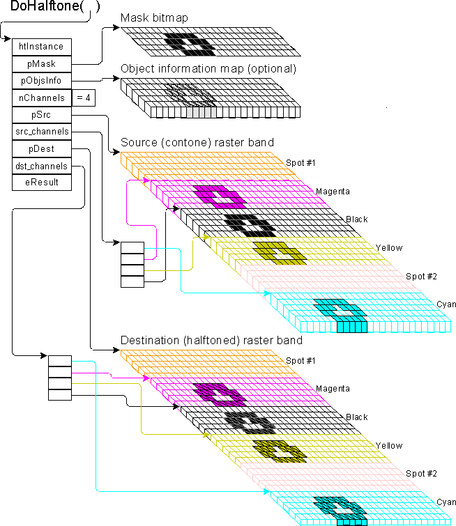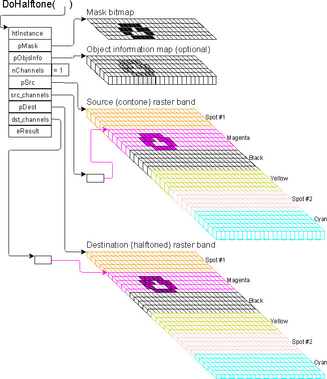 In the majority of cases, the RIP will invoke sw_htm_api::DoHalftone() separately for each channel, so there is only a single channel pointer into the source band, and a single channel pointer within the destination band. See Interrelated channels for details of when multiple channels are screened in a single call and therefore multiple offsets are supplied.