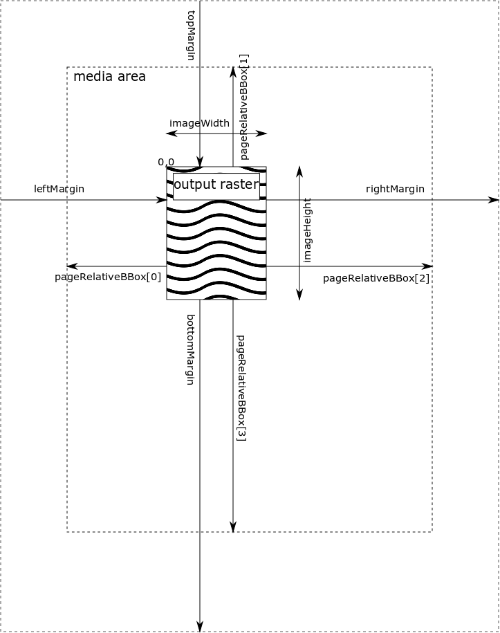 The image width and height, margins, and page relative bounding box can all be accessed from the RasterDescription structure. RasterDescription::imageWidth and RasterDescription::imageHeight are the actual size of the output raster, in pixels. The output raster size may have been restricted from the page raster set by the job or configuration if the /ImagingBBox and/or /TilingBBox keys were applied in the pagedevice (for example, when tiling output). The RasterDescription::pageRelativeBBox array gives the offsets from the output raster to the page raster, measured in pixels. The RasterDescription::leftMargin and RasterDescription::topMargin are offsets to the output raster from the output device's reference point: you would normally configure /LeftMargin and /TopMargin in the page device to shift the page raster past the unprintable area of a device. As presented in RasterDescription, the left and top margins include any extra translation resulting from restricting the page raster. The RasterDescription::rightMargin and RasterDescription::bottomMargin are offsets from the output raster to the other edge of the unprintable area of a device. The come from the /RightMargin and /BottomMargin configured in the page device, adjusted by any additional size from restricting the page raster.
